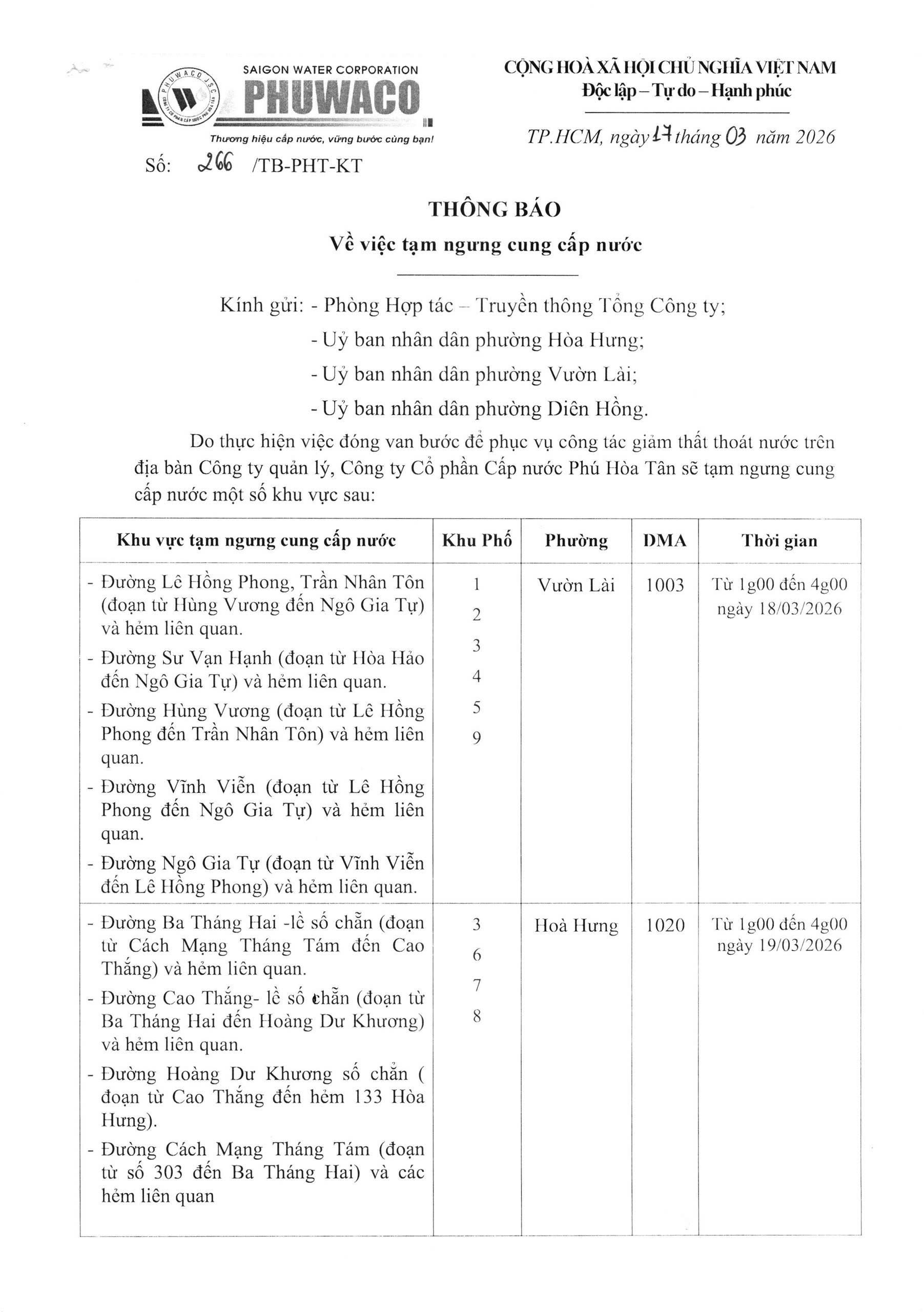 Thông báo tạm ngưng cung cấp nước phường Hòa Hưng, Vườn Lài, Diên Hồng