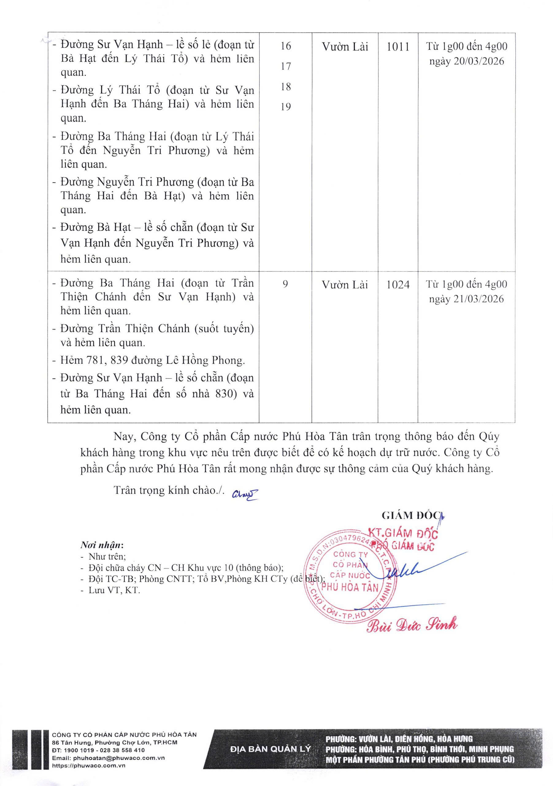 Công ty Cổ phần Cấp nước Phú Hòa Tân trân trọng thông báo Quý khách hàng được biết để có kế hoạch dự trữ nước phục vụ cho sản xuất và sinh hoạt. Công ty rất mong nhận được sự thông cảm của Quý khách hàng./.