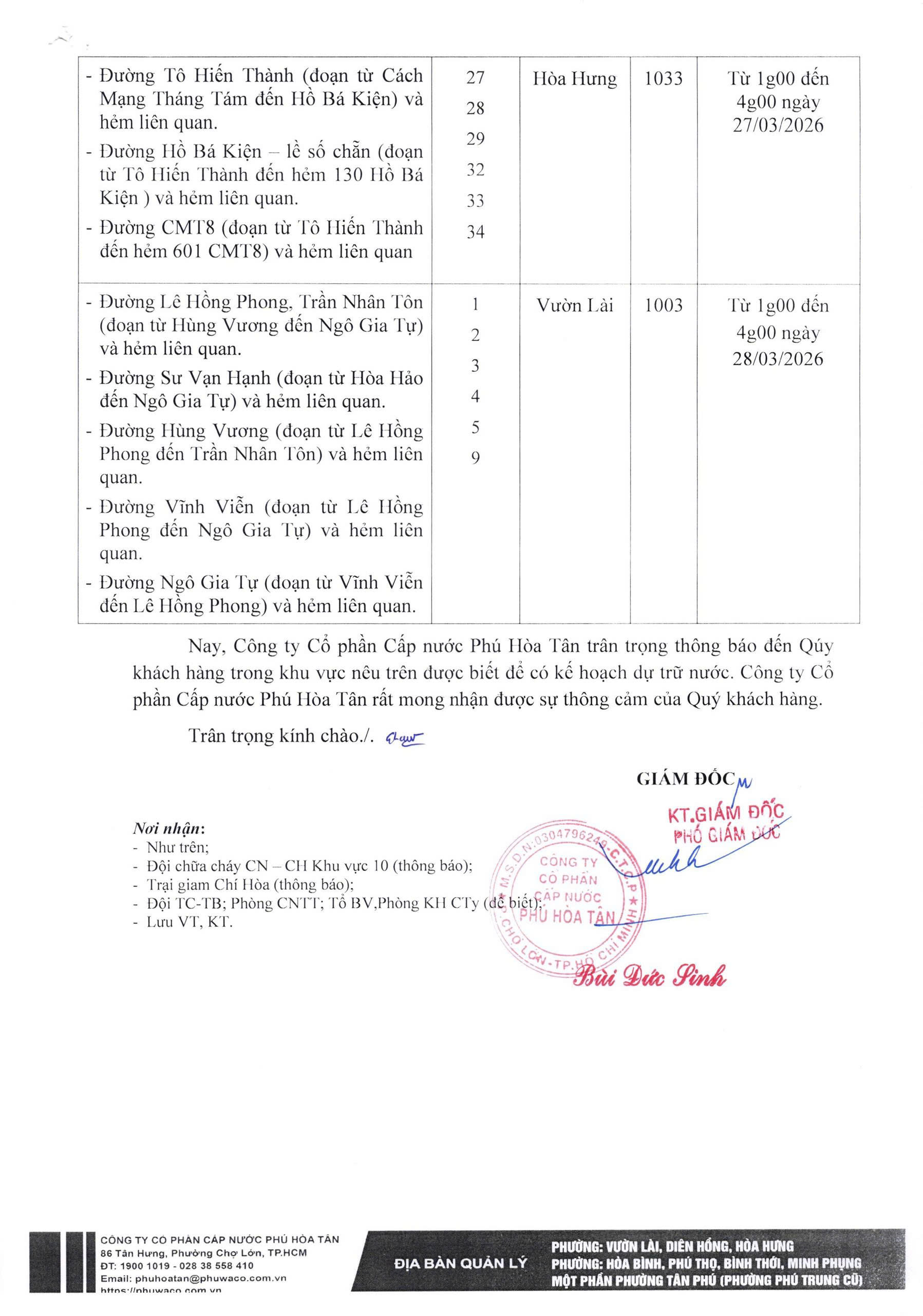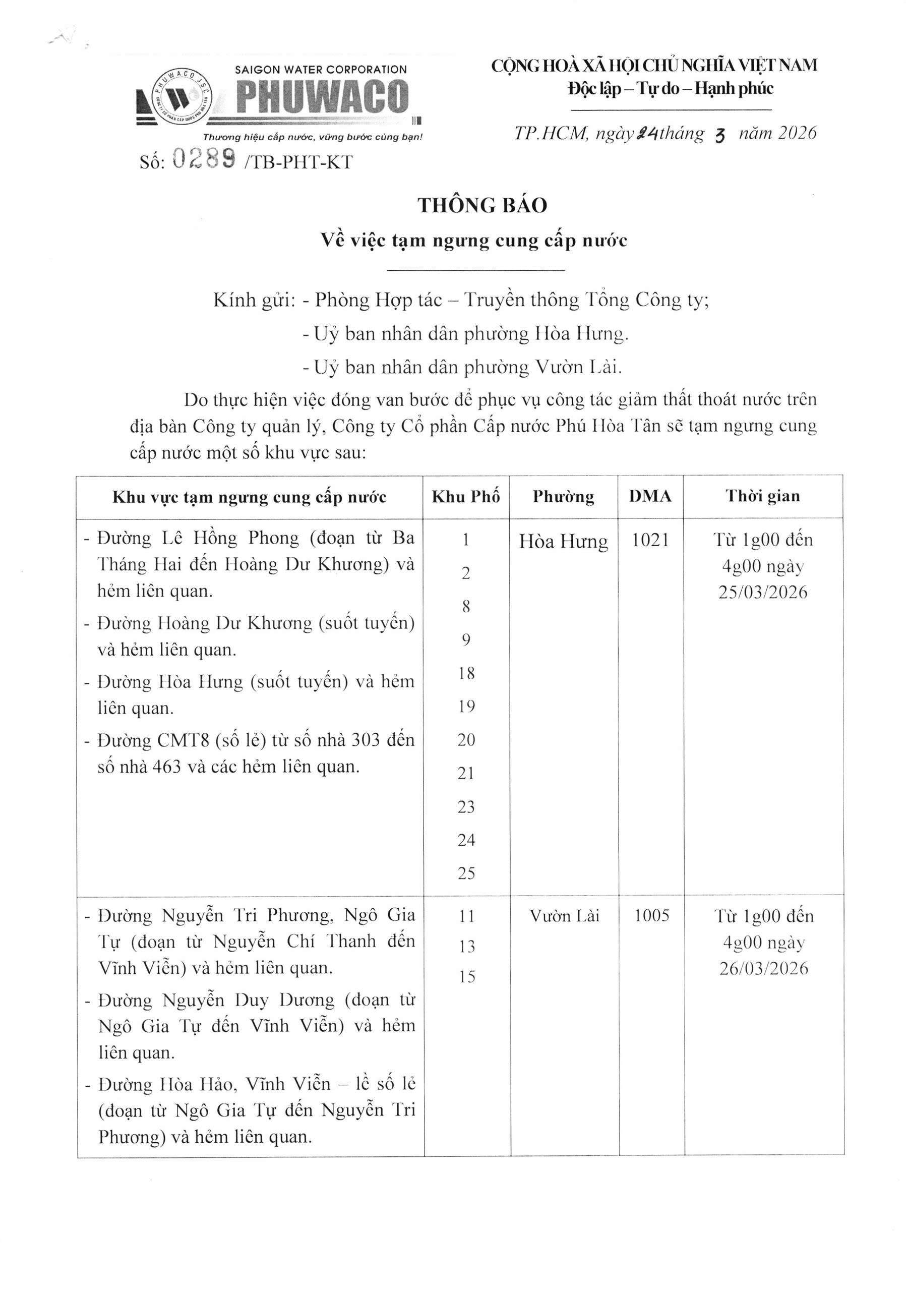 Thông báo tạm ngưng cung cấp nước phường Hòa Hưng, Vườn Lài
