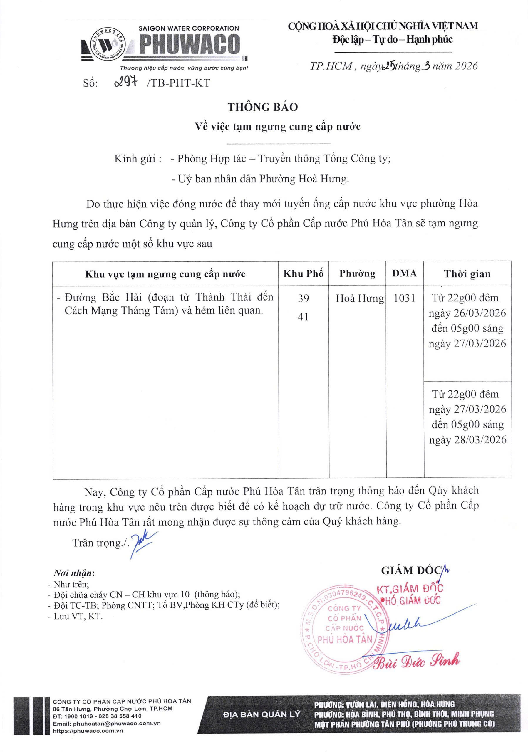 Công ty Cổ phần Cấp nước Phú Hòa Tân trân trọng thông báo Quý khách hàng được biết để có kế hoạch dự trữ nước phục vụ cho sản xuất và sinh hoạt. Công ty rất mong nhận được sự thông cảm của Quý khách hàng./.