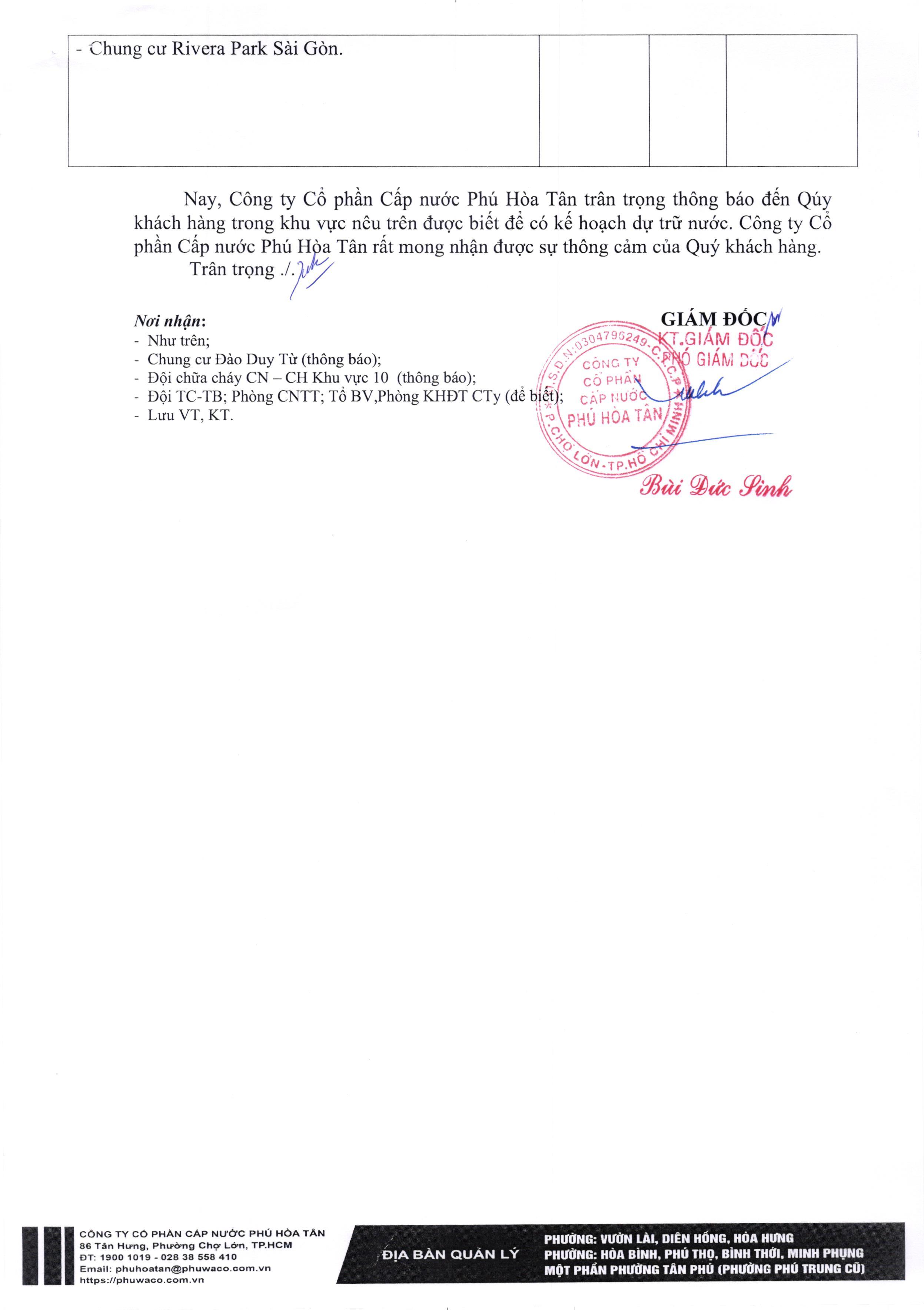 Công ty Cổ phần Cấp nước Phú Hòa Tân trân trọng thông báo Quý khách hàng được biết để có kế hoạch dự trữ nước phục vụ cho sản xuất và sinh hoạt. Công ty rất mong nhận được sự thông cảm của Quý khách hàng./.