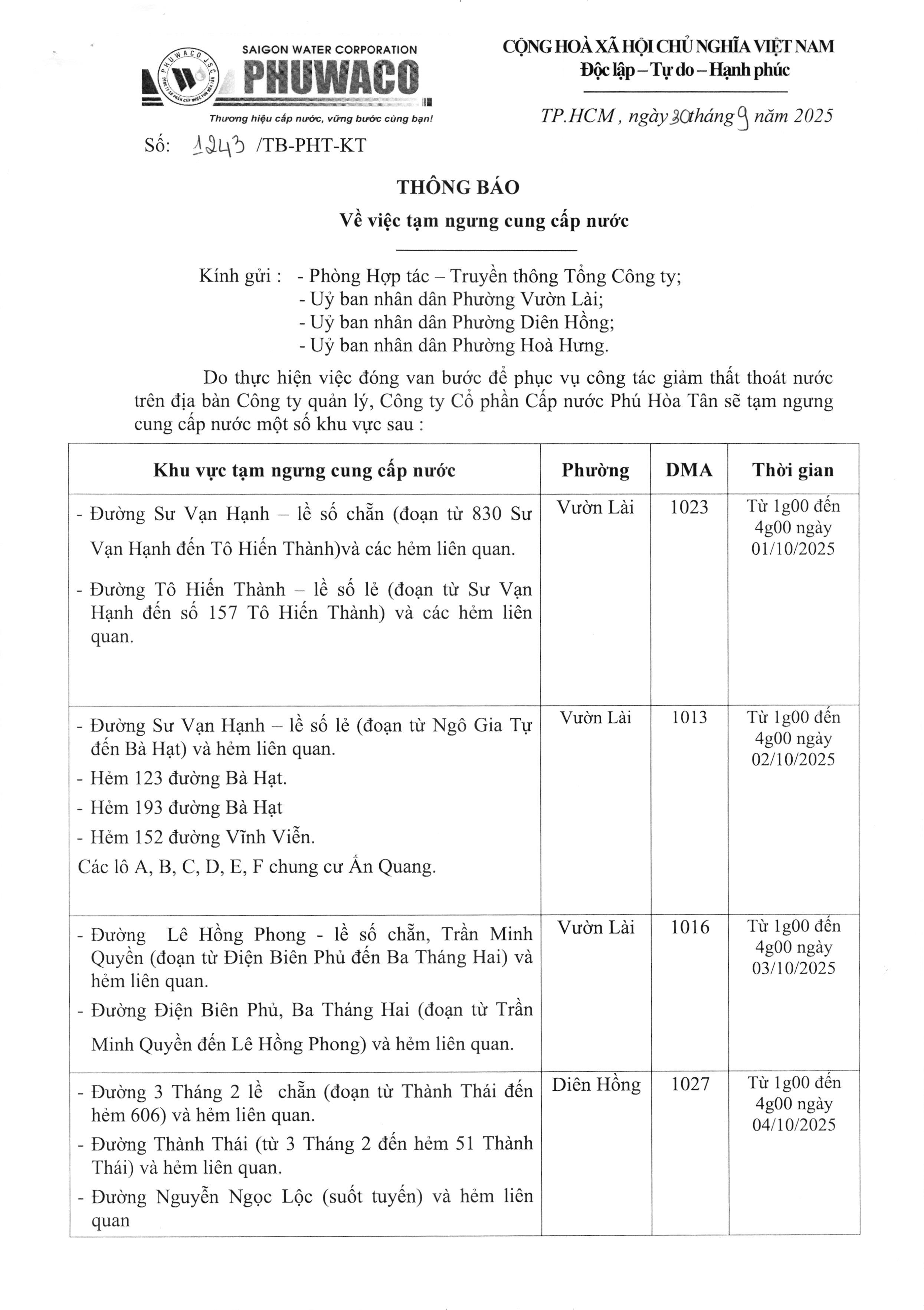 Thông báo tạm ngưng cung cấp nước phường Vườn Lài, Diên Hồng, Hòa Hưng