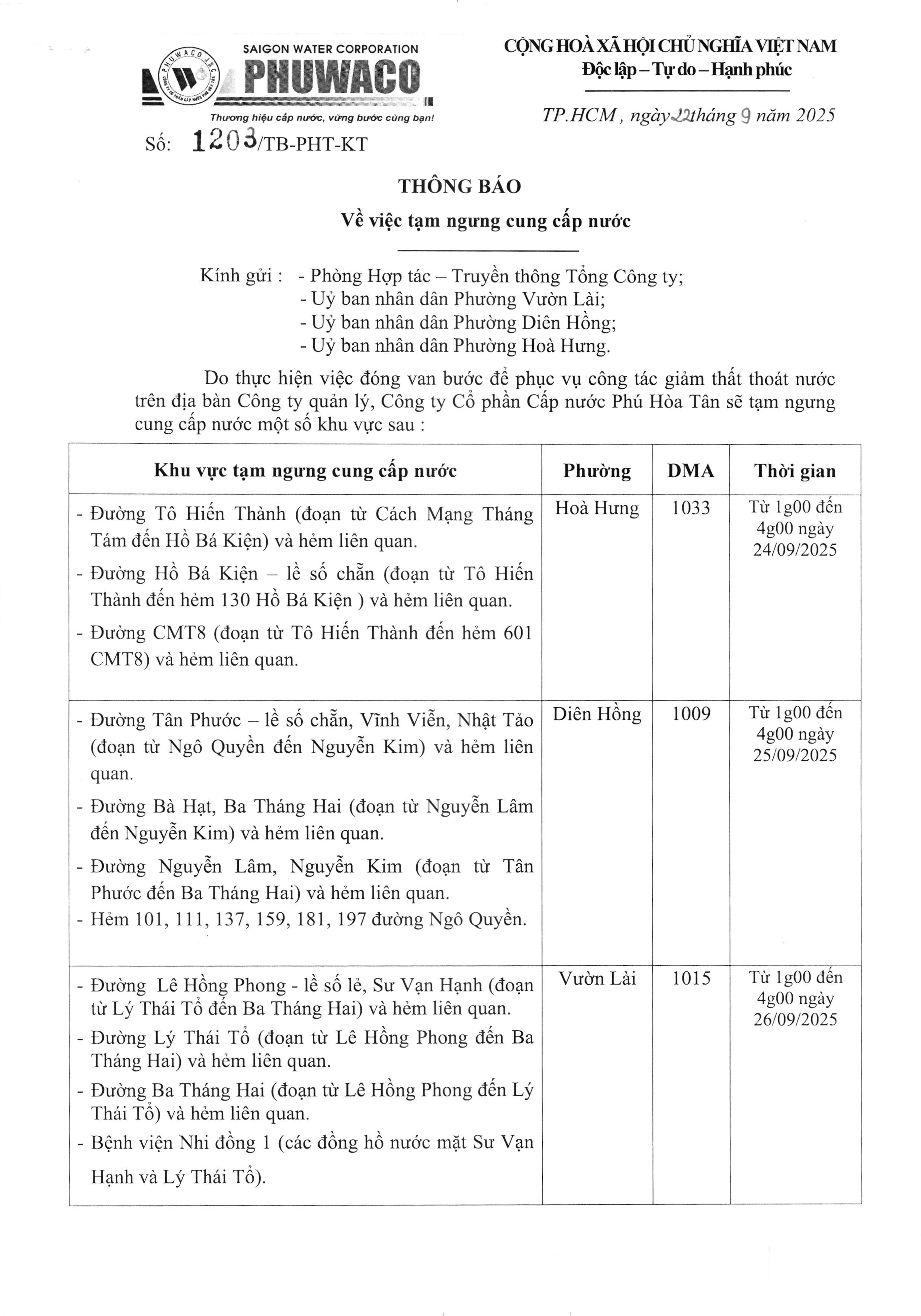 Thông báo tạm ngưng cung cấp nước phường Vườn Lài, Diên Hồng, Hòa Hưng