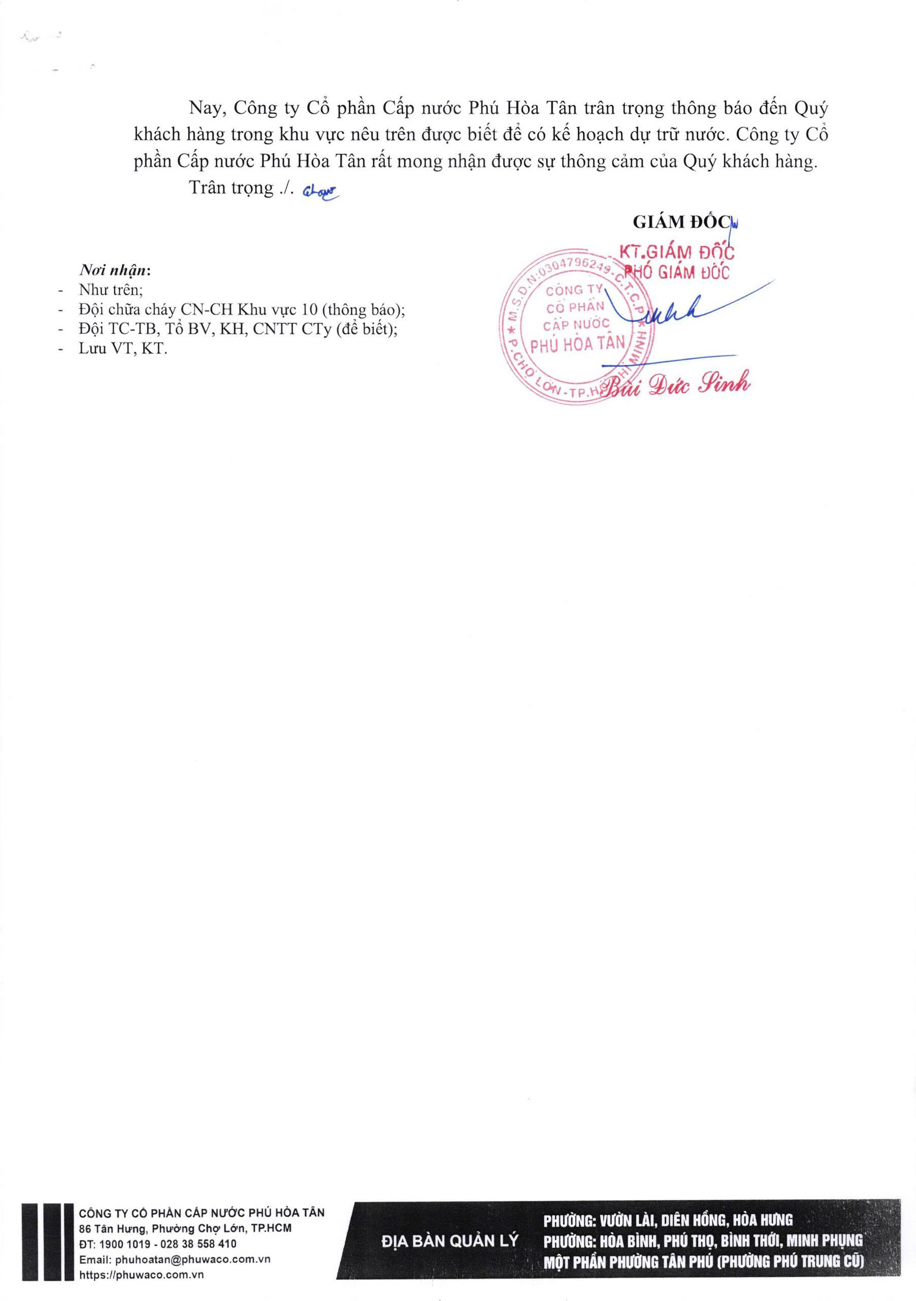 Công ty Cổ phần Cấp nước Phú Hòa Tân trân trọng thông báo Quý khách hàng được biết để có kế hoạch dự trữ nước phục vụ cho sản xuất và sinh hoạt. Công ty rất mong nhận được sự thông cảm của Quý khách hàng./.
