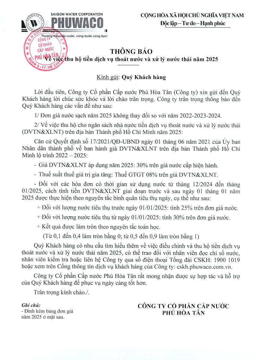 Thông báo về việc thu hộ tiền dịch vụ thoát nước và xử lý nước thải năm 2025