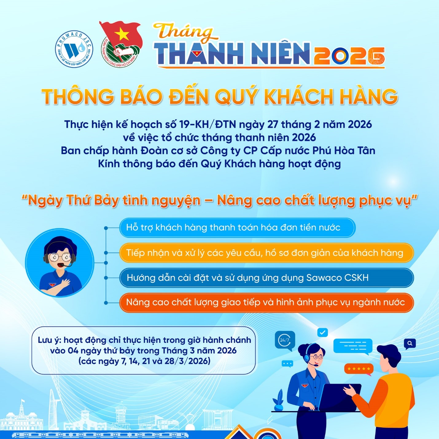 Hưởng ứng chương trình phát động của Thành Đoàn TP. Hồ Chí Minh và Ban Thường vụ Đoàn Tổng Công ty Cấp nước Sài Gòn về triển khai hoạt động “Ngày thứ bảy tình nguyện – Nâng cao chất lượng phục vụ”, ngày 07/3/2026, Ban Chấp hành Đoàn cơ sở Công ty Cổ phần Cấp nước Phú Hòa Tân đã tổ chức hoạt động tình nguyện tại quầy Chăm sóc khách hàng – Phòng Dịch vụ Khách hàng của đơn vị, góp phần hỗ trợ công tác chuyên môn, nâng cao chất lượng phục vụ và gia tăng sự hài lòng của người dân, khách hàng.